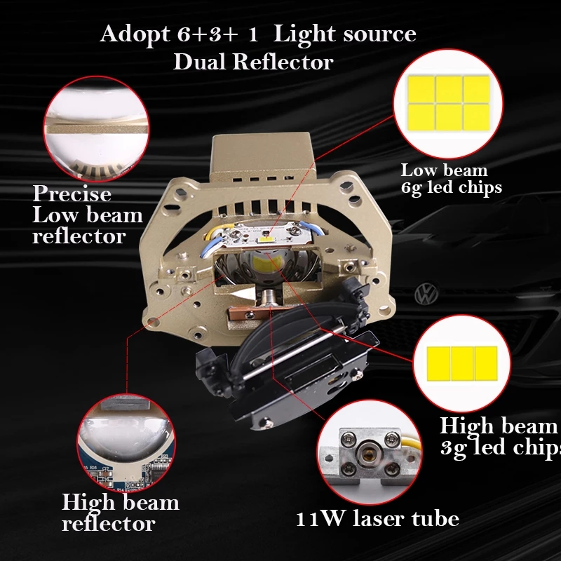 SANVI 3inch A8L Car Bi LED Laser &Lenses Projector LED Auto Lamp 66W 5500k 12000LUX Lenses With Hella 3R G5 Bracket Car StylingItem model: A8L bi led&laser projector LensVoltage: 9-16VLow beam power: 47wHigh beam&laser power:66WColor temperature:5500KChips: Low beam 6g led chips, high be......
